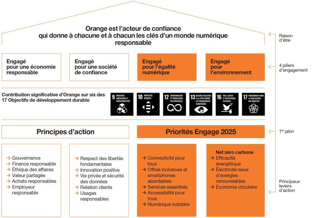 Inscrite dans nos statuts en 2020, notre raison d’être porte une voix distincte sur le marché des télécommunications, en mettant la technologie au service de l’humain. Elle structure nos décisions et traduit notre contribution aux défis sociétaux et environnementaux partagés par nos parties prenantes. Elle nourrit les quatre ambitions du plan stratégique Engage 2025 ainsi que notre engagement en faveur de l’égalité numérique et de la planète.